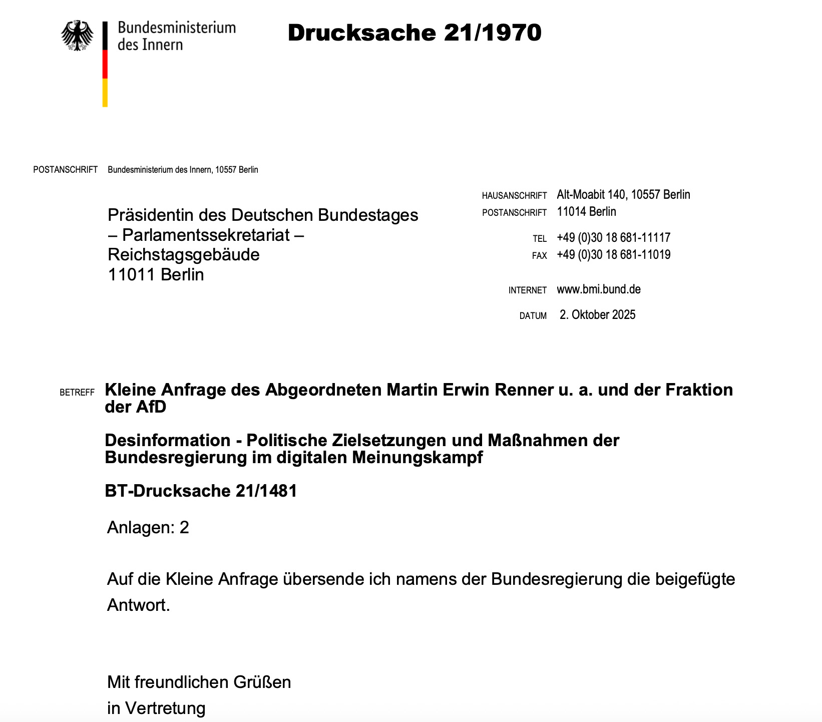 Die Antworten der Bundesregierung auf eine parlamentarische Anfrage zu Maßnahmen des Bundes gegen sogenannte Desinformation geraten zu einem Offenbarungseid. Aus den Antworten ergibt sich unter anderem, dass die Bundesregierung auf Grundlage einer höchst fragwürdigen Definition die Finanzierung für Projekte mit Schwerpunkt Desinformation in einem gigantischen Ausmaß gesteigert hat. Gefragt nach konkreten und aktuellen Fällen vonWeiterlesenRiepilogo